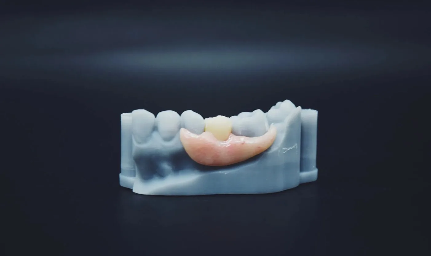 - Действия: Калибровка платформы, заливка смолы (биосовместимый фотополимер для временных конструкций).